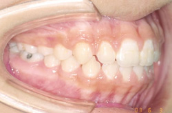 9歳7ヶ月の写真です。舌癖(飲み込む際に舌を突き出す癖)、指しゃぶりを防止するだけでも、だいぶ前歯が正常な位置になってきているのが分かります。