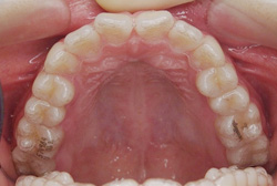 10歳8ヶ月の来院時には写真のように左右の上顎の5番目の歯が、他の歯の内側にはえています。正面から一見しては分かりませんが、内側に入っている歯が見えないため、歯が一本少なく見えています。歯を抜かずに治療を行っています。